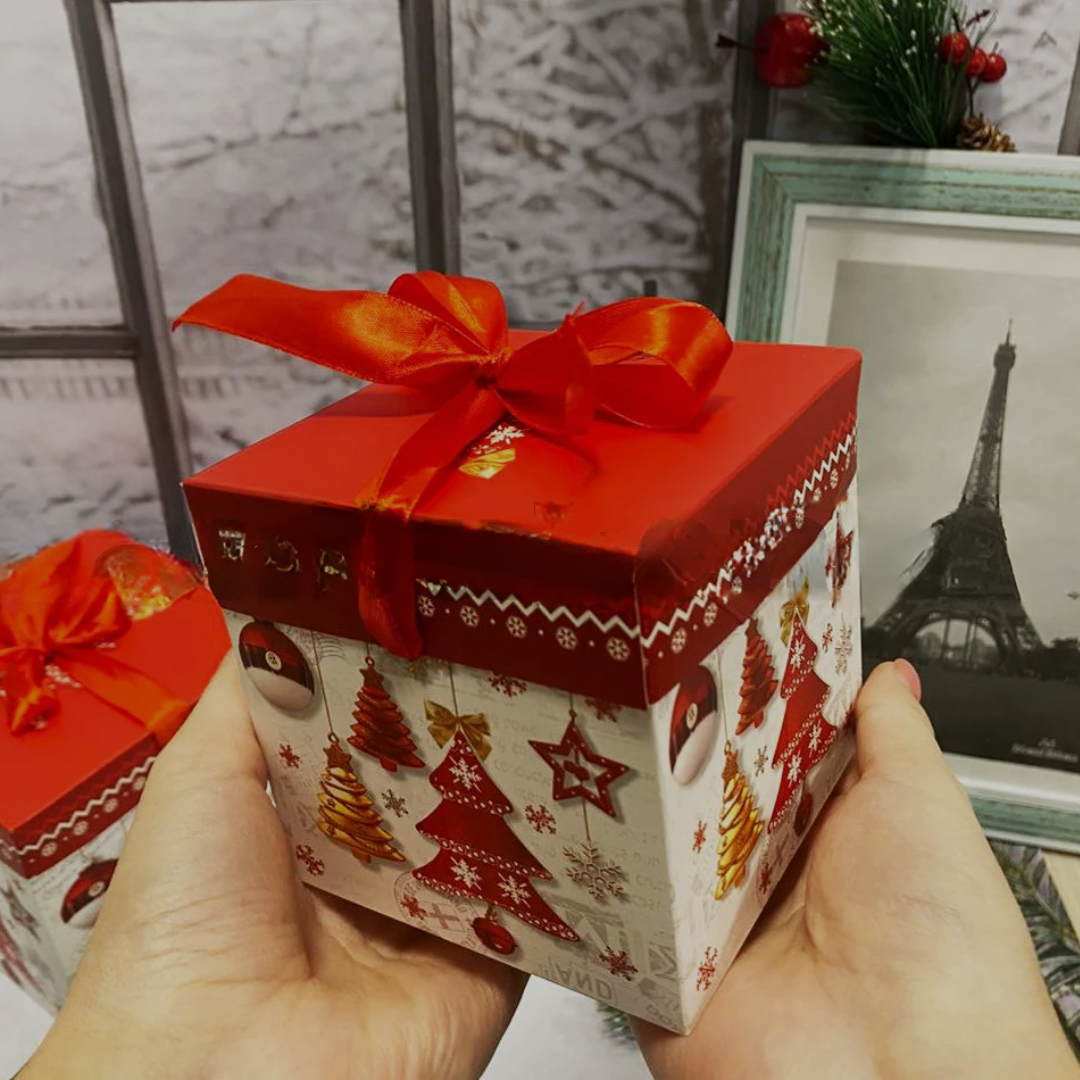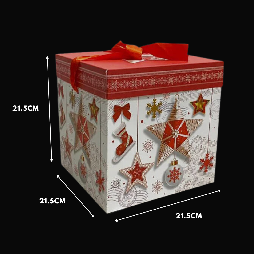 Estas cajas cuadradas de cartoncillo tienen un acabado con lazo satinada, lo que las hace perfectas para guardar decoración, regalos, y otros recuerdos navideños.